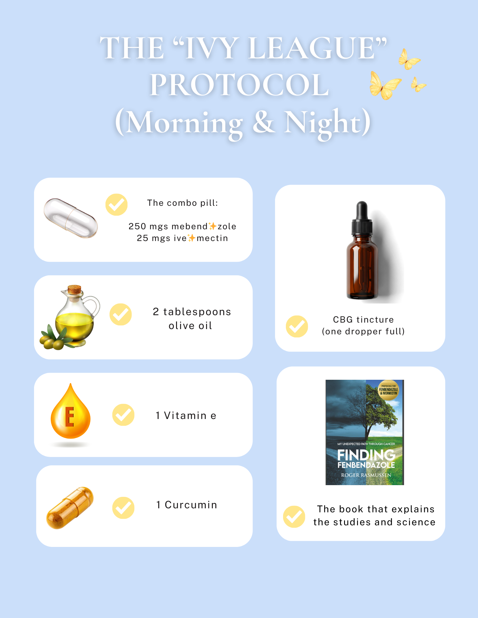 I call it that because if I mention its actual components—like ivermectin or fenbendazole—my content tends to get blocked on my social platforms. This protocol came together through extensive reading, research, and conversations with other cancer patients who had beaten odds and received “miraculous” cancer-free scans when they weren’t expected to. I don’t feel like a leader or an expert—just a mom sharing her story, someone who faced doctors who eventually had no more answers for me.